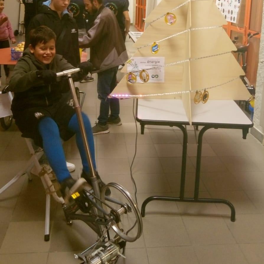 L’utilisateur se rend compte de l’effort qu’il doit fournir en fonction de la puissance générée. Le public prend conscience de notre forte consommation électrique et des alternatives possibles pour en sortir. Le vélo générateur peut alimenter différents appareils électriques. Par exemple, une guirlande enroulée du bas au haut d’un sapin de Noël s’illumine grâce au vélo générateur : plus on pédale, plus la lumière monte !